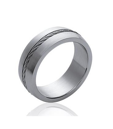 Bague acier anneau homme style alliance légèrement bombée câble d'acier torsadé au centre.